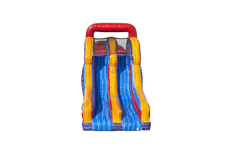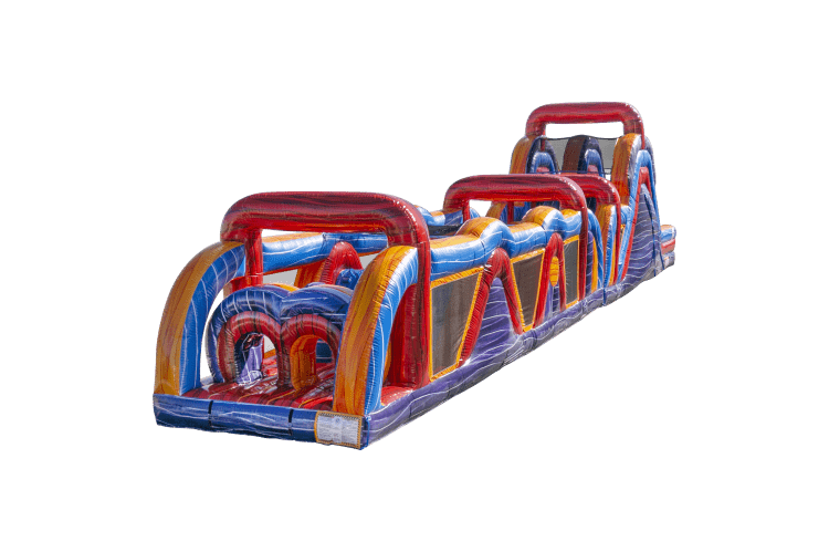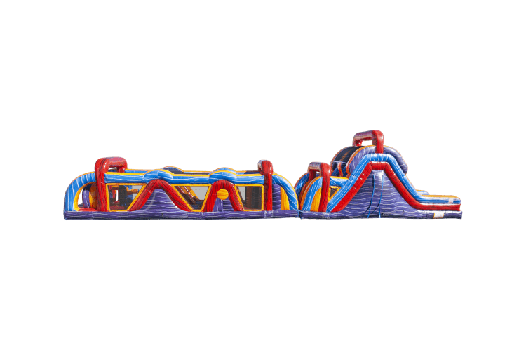 An 80-foot, high-energy obstacle course packed with crawl-through tunnels, pop-up hurdles, a climbing wall, and a fast finish slide. The bold marble-themed lanes let two people race side by side from start to finish, keeping lines moving and the crowd cheering. Big, colorful, and challenge-ready for teens and adults while still fun for younger kids with supervision.